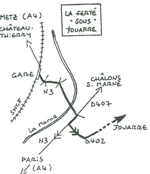 Autoroute A4 - sortie n°18 St Jean les Deux Jumeaux (50 mn Paris/Bercy) puis une fois à la Ferté-sous-Jouarre, en bas de la côte, face à la station-service BP :