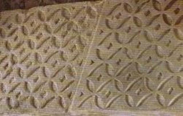 - Celui de droite abrite le tombeau de sainte Aguilberte, deuxième abbesse de Jouarre, qui était la cousine de Telchilde. Vous voyez qu’il est richement décoré avec deux sortes de sculptures : sur le côté, ce sont des dessins avec des SVASTIKA, symbole universel antique de prospérité, de mouvement et de bonheur, que l’on retrouve en bien des religions du monde, en particulier en Inde. Les autres décorations, sorte de « fleurs de lys » (mais qui ne sont pas des fleurs de lys !) se retrouvent sur des tissus sassanides de Perse du VIe siècle. On retrouve les décorations du sommet sur des mosaïques de Grèce, à Ephèse en particulier. On voit donc l’influence de l’Orient dans la crypte.