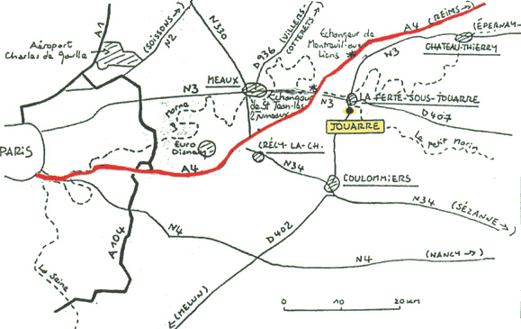Autoroute A4 - sortie n°18 St Jean les Deux Jumeaux (50 mn Paris/Bercy) puis une fois à la Ferté-sous-Jouarre, en bas de la côte, face à la station-service BP :