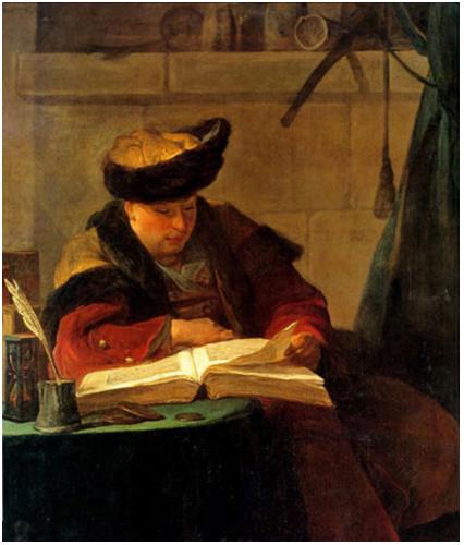 C’est le 4 décembre 1734 que Chardin mit la dernière main à ce tableau : « Un philosophe occupé de sa lecture ». Le sujet et la pose – un homme ou une femme lisant un livre ouvert sur une table – sont fréquents dans la peinture ; ce thème forme presque un sous-ensemble dans le genre des intérieurs domestiques. Il a des antécédents médiévaux et demeure populaire jusqu’en plein XIXème siècle. Mais ce motif du lecteur ou de la lectrice jouit d’une prévalence particulière au cours des XVIIème et XVIIIème siècles.