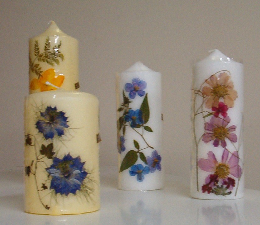 Chaque fleur est recueillie, séchée, puis mise en place – avec talent – sur des bougies de différentes tailles et teintes. Chacun selon ses goûts.