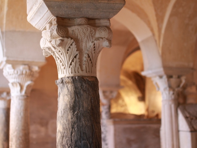 Vous voyez aussi deux rangées de colonnes de marbre antique surmontées de chapiteaux en marbre blanc des Pyrénées. Ils datent de la construction de la crypte au VIIe siècle. Les colonnes de marbre viennent de temples gallo-romains voisins et à l’abandon, on dit que ce sont des remplois.