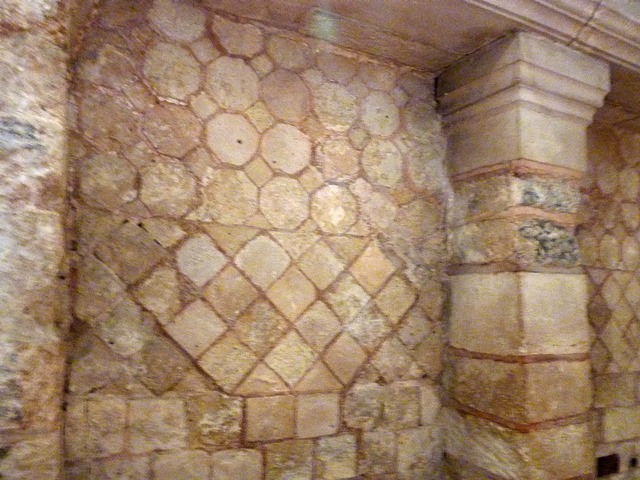 Vous voyez d’abord des rectangles, des losanges, taillés régulièrement et formant comme un réseau, ou les cases d’un damier. Ce sont des pierres de 25-30 cm de long, posées les unes sur les autres et tenues par un mortier. C’est la partie la plus ancienne, les maisons romaines aisées décoraient ainsi leurs murs. On retrouve ce genre d’appareil à l’ancienne Abbaye de Lorsch en Allemagne.