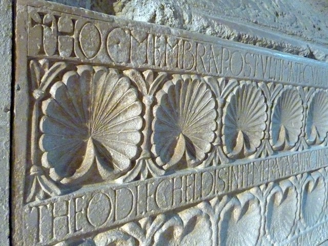 - ensuite une inscription sur les deux côtés du tombeau : elle dit que Telchilde « de naissance noble et éclatante de mérites, mère de ce monastère, a voulu enseigner à ses filles à courir au-devant du Christ avec leurs lampes allumées », telles les vierges sages de la parabole. « Maintenant, elle exulte de joie dans le paradis »