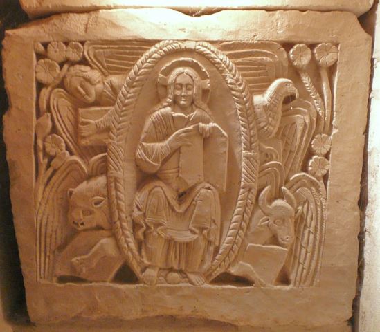 Pour voir le plus beau de la crypte, à la tête du tombeau d’Agilbert, il faut ressortir et se baisser pour entrer dans la petite alcôve qui abrite le magnifique Christ dit « Tétramorphe », ou Christ avec les quatre Évangélistes. Il a été remis en valeur lors des travaux de la crypte en 1978. Au cours des siècles, pour une raison inconnue, le tombeau d’Agilbert a été déplacé contre le mur, ce qui a permis de sauvegarder cette sculpture. Heureusement. C’est la plus ancienne reproduction connue du Christ Tétramorphe en Occident.