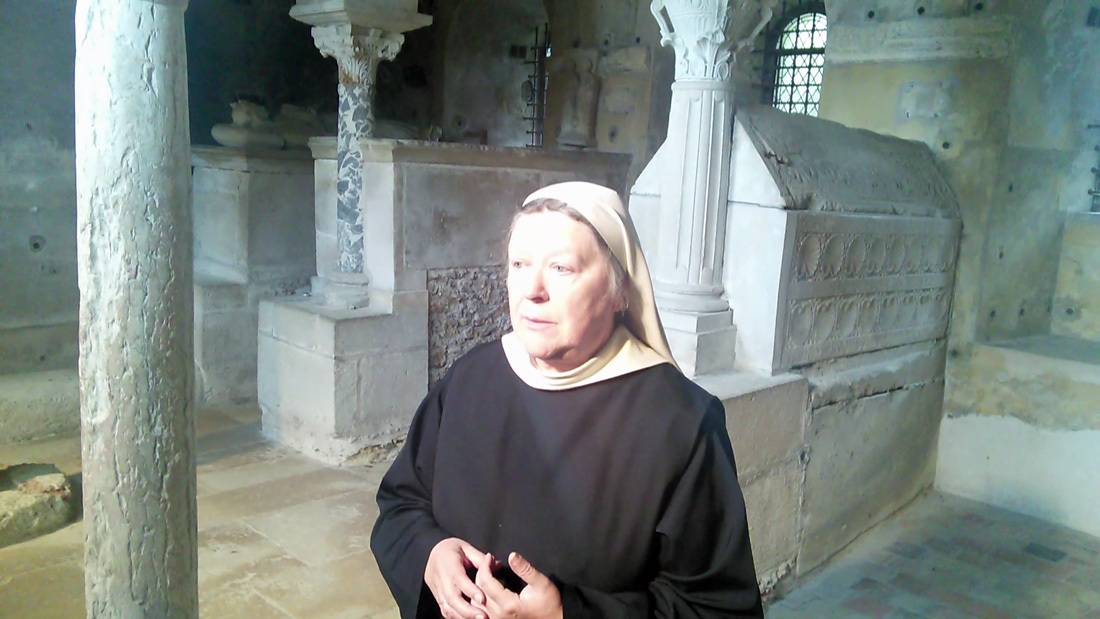 Il y a aussi un tombeau qui semble occuper la place centrale, celui de l’abbesse Telchilde, première abbesse de notre monastère. La crypte a été construite pour elle, à cause de la grande vénération dont était entourée sa sainteté. Elle n’a pas fondé le monastère, mais elle en a été la première abbesse. Le monastère a été fondé par Adon, l’aîné de sa fratrie, bénie par Saint Colomban, lorsque celui-ci s’arrêta à Ussy-sur-Marne en 610, à quelques kilomètres d’ici.