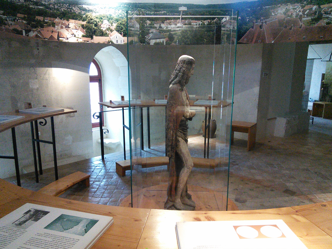 A gauche, accès au magasin des artisanats monastiques, et départ de la visite de la Tour pour les personnes qui le désirent. On accède par un escalier à vis dans la salle historique du premier étage, qui vous retracera 13 siècles de la vie du monastère. Au centre, un magnifique Christ aux outrages vous attend et vous accueille !